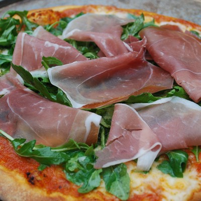 Price: €13,00 Menu: Pizzas Author: Black&White Tomato sauce, Mozzarella, Parma ham, rocket and Parmesan