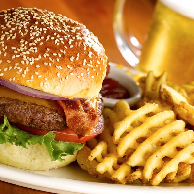 Con lechuga, tomate, cebolla salteada y mayonesa. Servido con patatas fritas