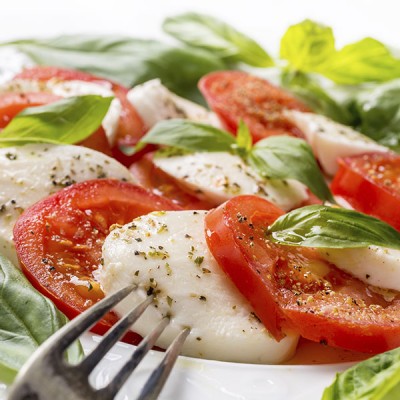 Mozzarella de búfala, tomate fresco, aguacate y aderezado con salsa de albahaca